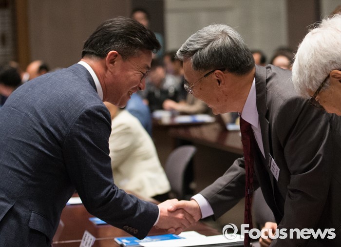 (서울=포커스뉴스) 천안함 피격사건을 계기로 5·24 대북제재 조치가 취해진 지 6년이 되는 날인 24일 오후 서울 중구 프레스센터에서 열린 '통일공감포럼 발족식 및 통일공감대화'에 참석한홍용표(왼쪽) 통일부 장관 이종석 전 통일부 장관이 인사하고 있다.
