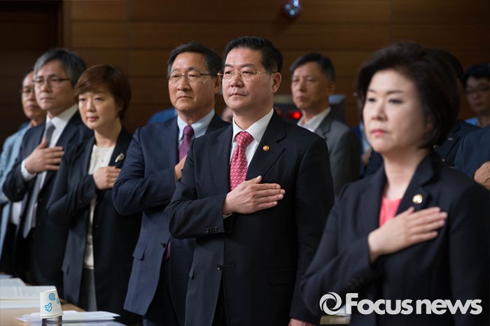 (서울=포커스뉴스) 24일 오후 서울 중구 포스트타워에서 열린 부정청탁 및 금품 등 수수 금지에 관한 법률(일명 김영란법) 입법예고안에 대한 공청회에 참석한 성영훈(오른쪽 두 번째) 국민권익위원회 위원장이 국민의례를 하고 있다.