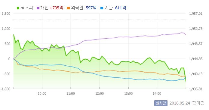 이날 코스피는 전일 대비 0.21% 하락한 1951.18로 장을 시작했다. 이후 지수는 약보합권에서 움직이다가 기관과 외국인의 동반 매도세에 하락폭이 확대됐다.