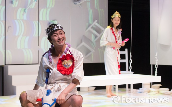 (서울=포커스뉴스) 24일 오후 서울 종로구 CJ아지트 대학로점에서 열린 연극 '크레센도 궁전' 프레스콜에 참여한 배우 권일(왼쪽)이 주요장면을 시연하고 있다.
