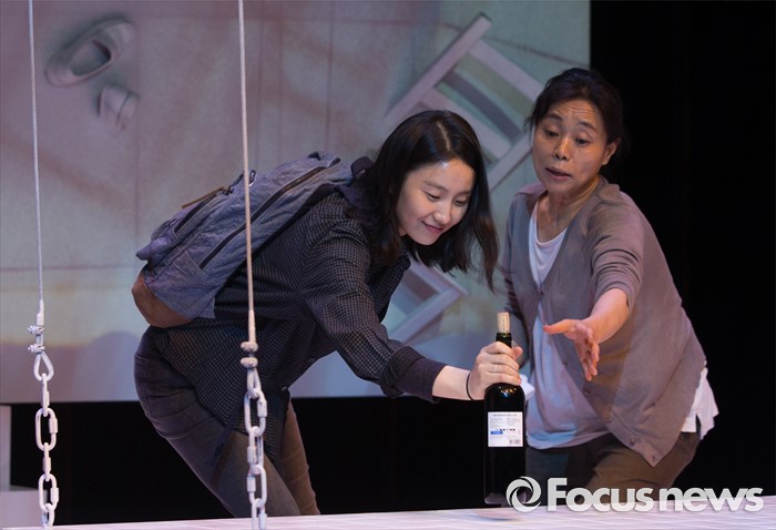 (서울=포커스뉴스) 24일 오후 서울 종로구 CJ아지트 대학로점에서 열린 연극 '크레센도 궁전' 프레스콜에 참여한 배우 김소진(왼쪽)과 강애심이 주요장면을 시연하고 있다.
