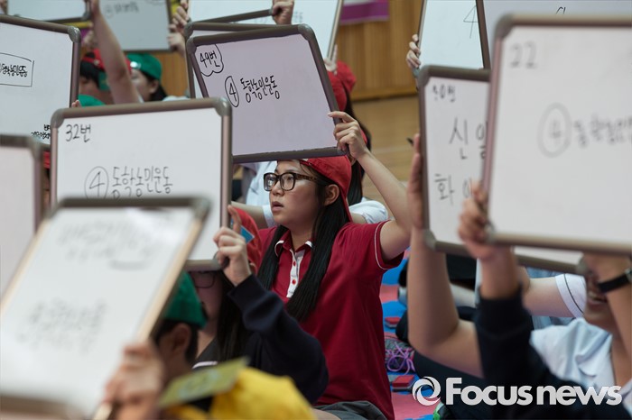 (서울=포커스뉴스) 24일 오후 서울 강북구 신일중학교 체육관에서 열린 근현대사기념관 개관 기념 '역사 골든벨'에 참석한 학생들이 본선 골든벨 퀴즈를 풀고 있다.
