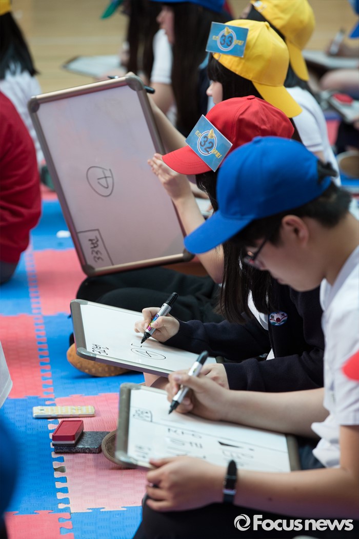 (서울=포커스뉴스) 24일 오후 서울 강북구 신일중학교 체육관에서 열린 근현대사기념관 개관 기념 '역사 골든벨'에 참석한 학생들이 본선 골든벨 퀴즈를 풀고 있다.