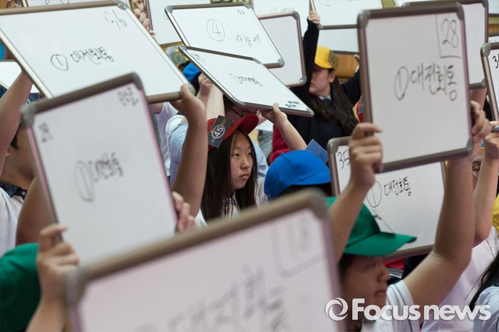 (서울=포커스뉴스) 24일 오후 서울 강북구 신일중학교 체육관에서 열린 근현대사기념관 개관 기념 '역사 골든벨'에 참석한 학생들이 본선 골든벨 퀴즈를 풀고 있다.