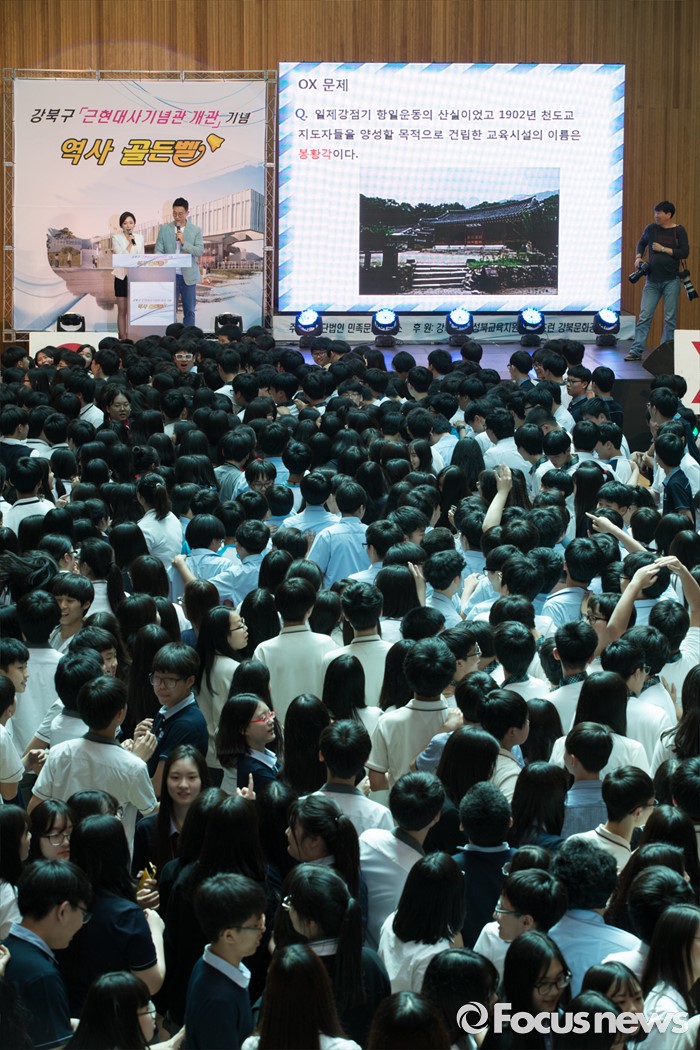 (서울=포커스뉴스) 24일 오후 서울 강북구 신일중학교 체육관에서 열린 근현대사기념관 개관 기념 '역사 골든벨'에 참석한 학생들이 예선전 O.X 퀴즈를 풀고 있다.