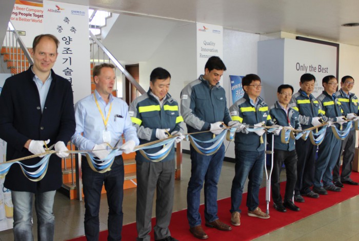 오비맥주 관계자는 "양조기술연구소는 오비맥주의 이름으로 선보인 모든 맥주 제품의 산실"이라며 "이번 증설을 통해 품질관리를 강화하고 소비자 기호에 맞는 다양한 제품 개발에 더욱 집중할 것"이라고 밝혔다.오비맥주 김도훈 대표(왼쪽 4번째)와 관계자들이 양조기술연구소 증축식에서 테이프 커팅을 하고 있다.<사진제공=오비맥주>