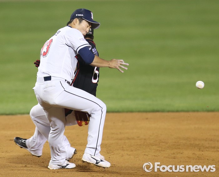 (서울=포커스뉴스) 24일 서울 잠실구장에서 열린 2016프로야구 kt-두산 경기 6회초 1사 1,3루에서 kt 전민수의 2루수 옆 안타때 1루주자 박경수가 3루로 뛰다 두산 3루수 허경민과 충돌하고 있다.