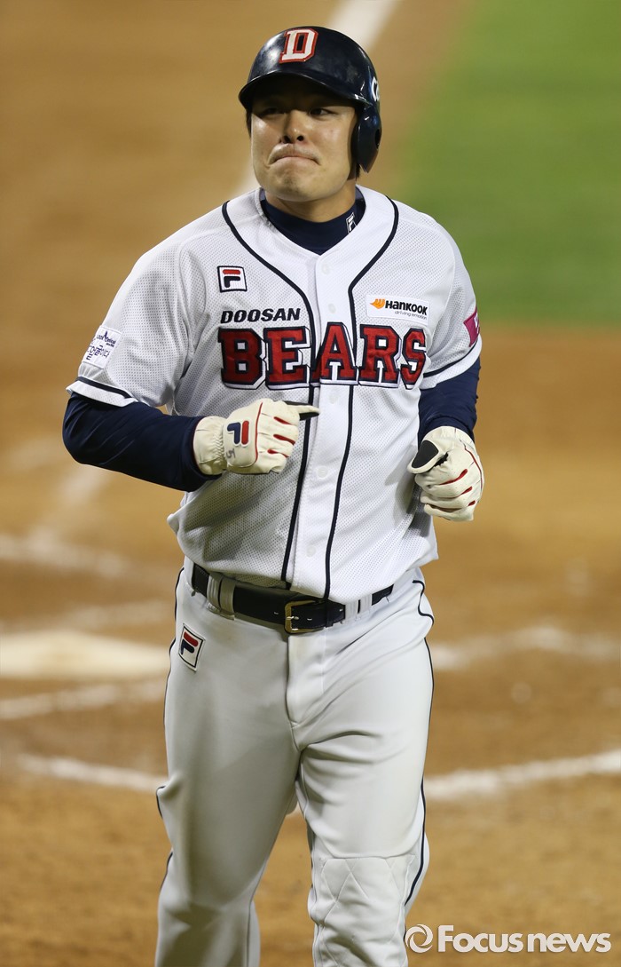 (서울=포커스뉴스) 24일 서울 잠실구장에서 열린 2016프로야구 kt-두산 경기 7회말 무사 3루에서 두산 오재일의 좌전 안타로 3루주자 민병헌이 홈인하고 있다.