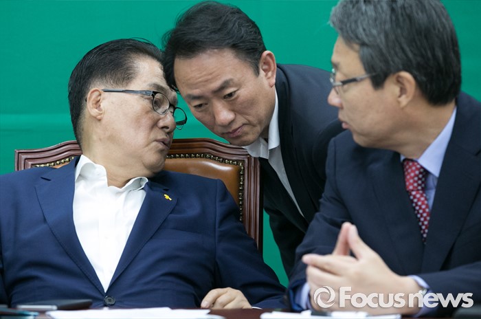 (서울=포커스뉴스) 25일 오전 서울 여의도 국회에서 열린 국민의당 최고위원회의에 참석한 박지원(왼쪽) 원내대표와 김명진(가운데) 원내대표비서실장이 대화하고 있다. 오른쪽은 김성식 정책위의장.