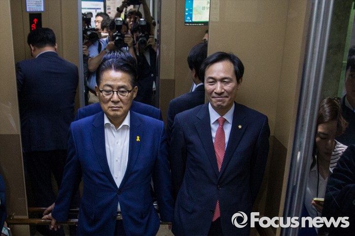 (서울=포커스뉴스) 우상호(오른쪽) 더불어민주당 원내대표와 박지원 국민의당 원내대표가 25일 오전 서울 여의도 국회의원회관에서 열린 '공영언론 지배구조 개선 위한 20대 국회의 역할과 과제 토론회'에 참석해 인사말을 마친 뒤 승강기에 탑승 하고 있다.