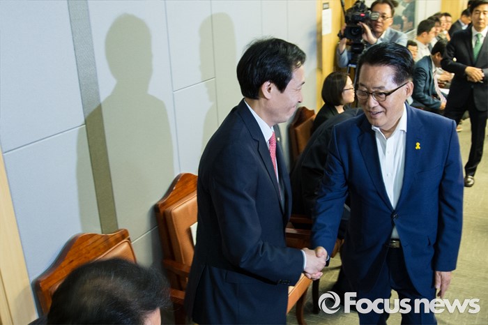 (서울=포커스뉴스) 우상호(왼쪽) 더불어민주당 원내대표와 박지원 국민의당 원내대표가 25일 오전 서울 여의도 국회의원회관에서 열린 '공영언론 지배구조 개선 위한 20대 국회의 역할과 과제 토론회'에 참석해 악수하고 있다.