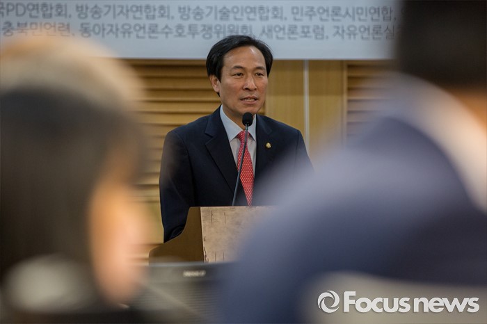 (서울=포커스뉴스) 우상호 더불어민주당 원내대표가 25일 오전 서울 여의도 국회의원회관에서 열린 '공영언론 지배구조 개선 위한 20대 국회의 역할과 과제 토론회'에 참석해 인사말을 하고 있다.