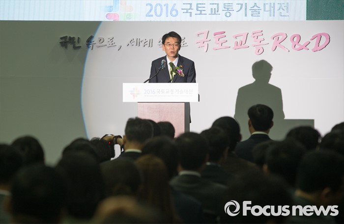 (서울=포커스뉴스) 25일 오전 서울 강남구 코엑스에서 열린 국토교통부 주최'2016 국토교통기술대전' 개막식에 참석한 강호인 국토교통부 장관이 기념사를 하고 있다.