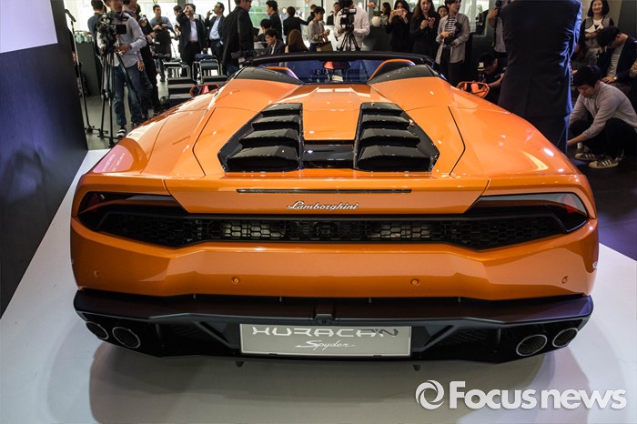 (서울=포커스뉴스) 25일 오전 서울 강남구 람보르기니 서울에서 열린 람보르기니 우라칸 LP 610-4 스파이더 출시 행사에서 업체 관계자들이 차량을 선보이고 있다.