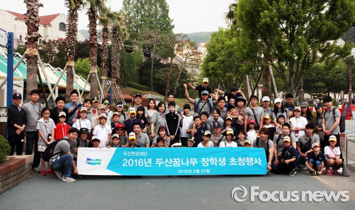(서울=포커스뉴스) 두산연강재단은 25일 '두산꿈나무 장학생'으로 선발된 초등학생 114명을 경기도 용인시에 위치한 에버랜드로 초청해 두산 임직원들과 함께하는 테마파크 체험 행사를 진행했다.