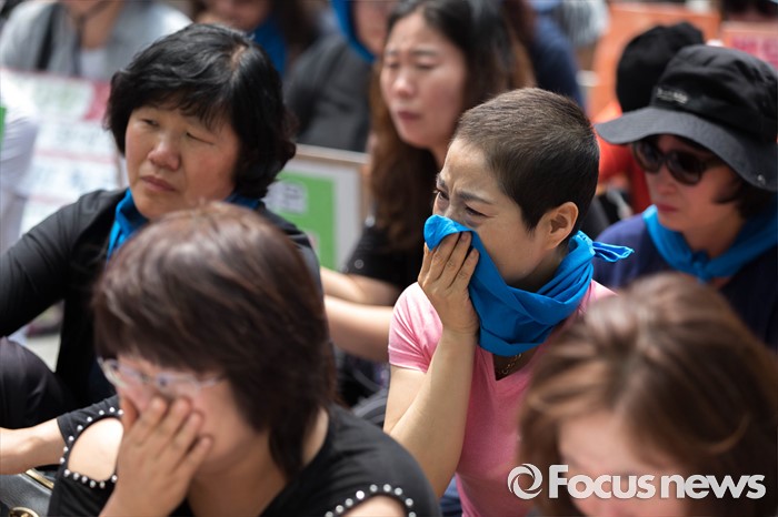 (서울=포커스뉴스) 25일 오전 서울 중구 서울시청 앞에서 열린 발달장애인 종합대책요구 무기한 삭발투쟁 2일차 기자회견에서 서울시 장애인 부모회 회원들이 눈물을 흘리고 있다.