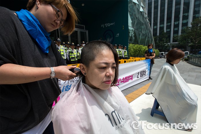 (서울=포커스뉴스) 25일 오전 서울 중구 서울시청 앞에서 열린 발달장애인 종합대책요구 무기한 삭발투쟁 2일차 기자회견에서 정희경(왼쪽) 전국장애인부모연대 서울지부 부대표