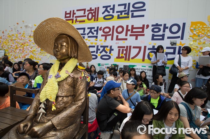 (서울=포커스뉴스) 25일 오전 서울 종로구 옛 일본대사관 앞에서 열린 '제1232차 일본군 위안부 문제해결을 위한 정기 수요시위'에 참석한 학생들이 참석하고 있다.