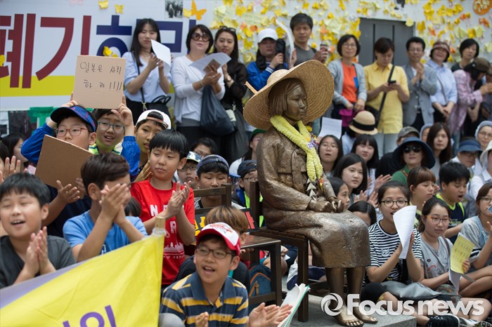 (서울=포커스뉴스) 25일 오전 서울 종로구 옛 일본대사관 앞에서 열린 '제1232차 일본군 위안부 문제해결을 위한 정기 수요시위'에 참석한 학생들이 참석하고 있다.