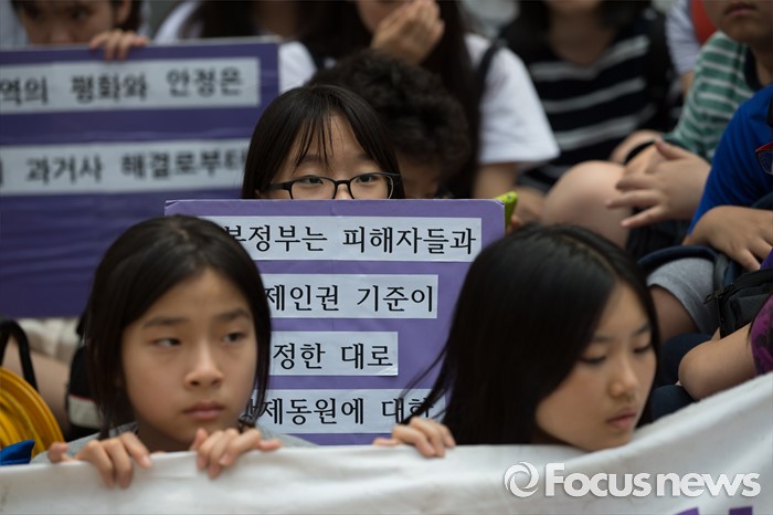 (서울=포커스뉴스) 25일 오전 서울 종로구 옛 일본대사관 앞에서 열린 '제1232차 일본군 위안부 문제해결을 위한 정기 수요시위'에 참석한 학생들이 피켓을 들고 있다.
