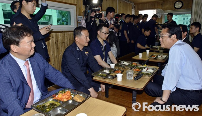(서울=포커스뉴스) 정진석 새누리당 원내대표가 25일 서울 여의도 당사 앞에서 근무하는 경비중대를 격려 방문해 의경들과 오찬 간담회를 하고 있다.