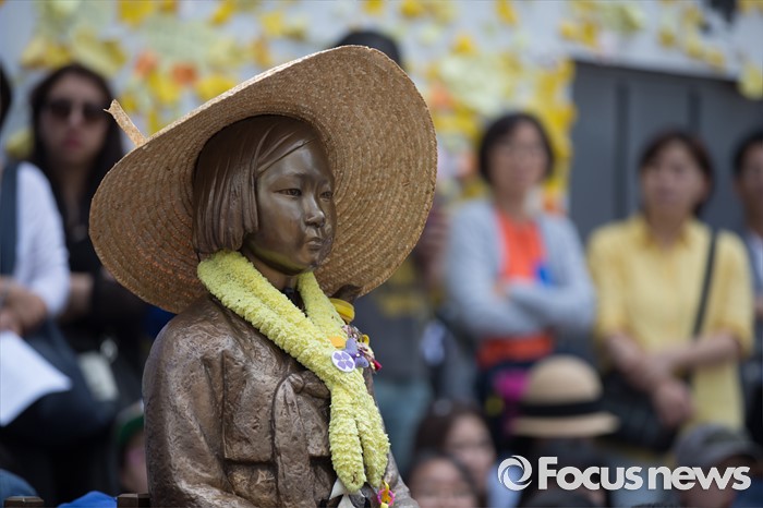 (서울=포커스뉴스) 25일 오전 서울 종로구 옛 일본대사관 앞에서 열린 '제1232차 일본군 위안부 문제해결을 위한 정기 수요시위'에 시민들이 사회자의 발언을 지켜보고 있다.