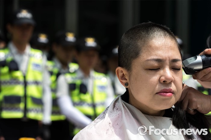 (서울=포커스뉴스) 25일 오전 서울 중구 서울시청 앞에서 열린 발달장애인 종합대책요구 무기한 삭발투쟁 2일차 기자회견에서 정희경 전국장애인부모연대 서울지부 부대표가 삭발을 하고 있다.