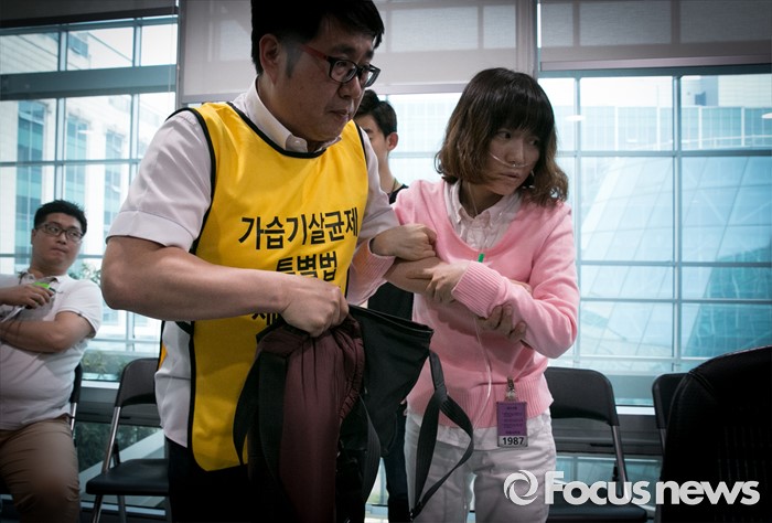 (서울=포커스뉴스) 가습기 살균제 피해자와 가족모임의 윤정애(오른쪽) 씨가 25일 오후 서울 여의도 국회 의원회관에서 박지원 국민의당 원내대표와 면담을 위해 이동하고 있다.