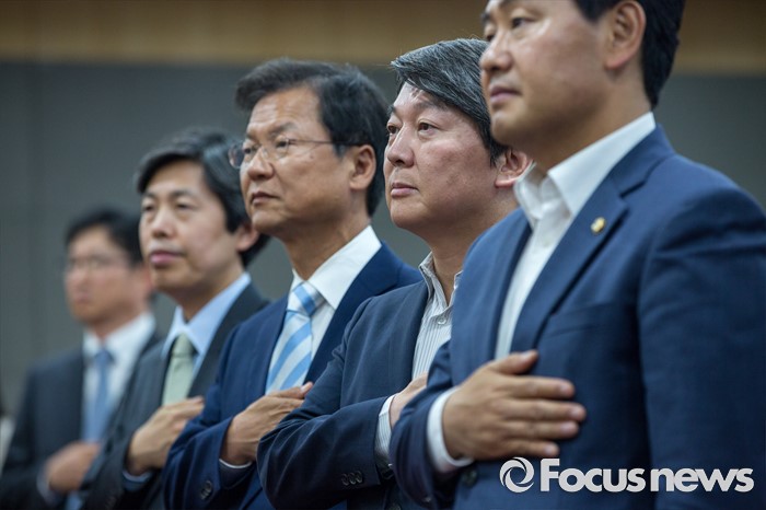 (서울=포커스뉴스) 안철수(오른쪽 두 번째) 국민의당 상임공동대표와 천정배(오른쪽 두 번째) 국민의당 공동대표가 25일 오후 서울 여의도 국회의원회관에서 열린 '제조물 책임법 문제점 개선방안 토론회'에 참석해 국민의례 하고 있다.