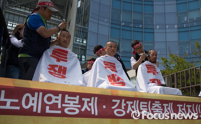 (세종=포커스뉴스) 25일 오후 세종시 정부세종청사 기획재정부 앞에서 공기업정책연대 구성원들이 성과연봉제 저지 및 강제퇴출제 반대 수요집회에서 삭발식을 하고 있다.