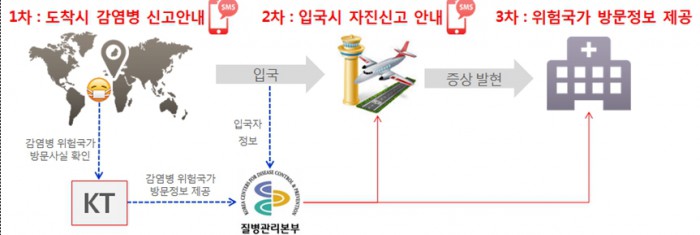 이번 업무협약에 따르면 질병관리본부는 해외 감염병 및 오염지역 정보를 KT에 제공하고, KT는 로밍 빅데이터를 활용한 오염지역 방문 후 입국한 가입자 정보를 질병관리본부로 제공, 입국하는 가입자에게는 신고안내 정보 등 문자서비스를 송신한다.