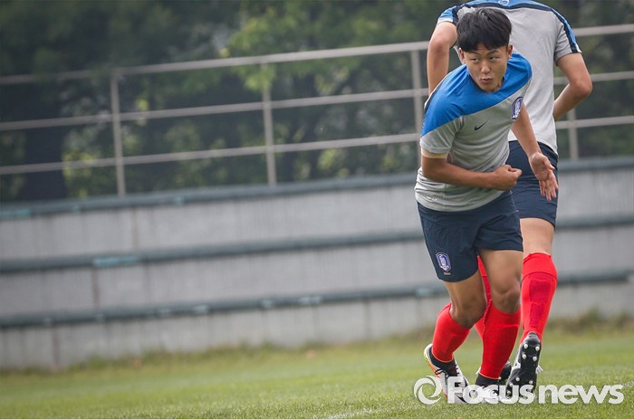 (파주=포커스뉴스) 이승우(18, 바르셀로나 후베닐A)가 25일 오후 경기도 파주 NFC에서 잉글랜드 U18(18세 이하) 대표팀과의 친선전을 앞두고 축구대표팀 선수들과 소집 훈련에 임하고 있다.