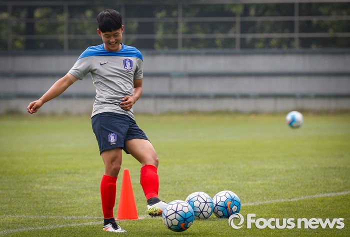(파주=포커스뉴스) 이승우(18, 바르셀로나 후베닐A)가 25일 오후 경기도 파주 NFC에서 잉글랜드 U18(18세 이하) 대표팀과의 친선전을 앞두고 축구대표팀 선수들과 소집 훈련에 임하고 있다.