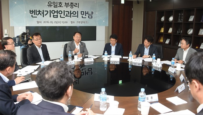 (성남=포커스뉴스) 유일호 부총리 겸 기획재정부 장관이 25일 벤처.창업 관련 현장방문의 일환으로 경기도 판교 테크노벨리 소재 (주)크루셜텍을 방문, 관계자들과 간담회를 갖고 있다. <사진제공=기획재정부>