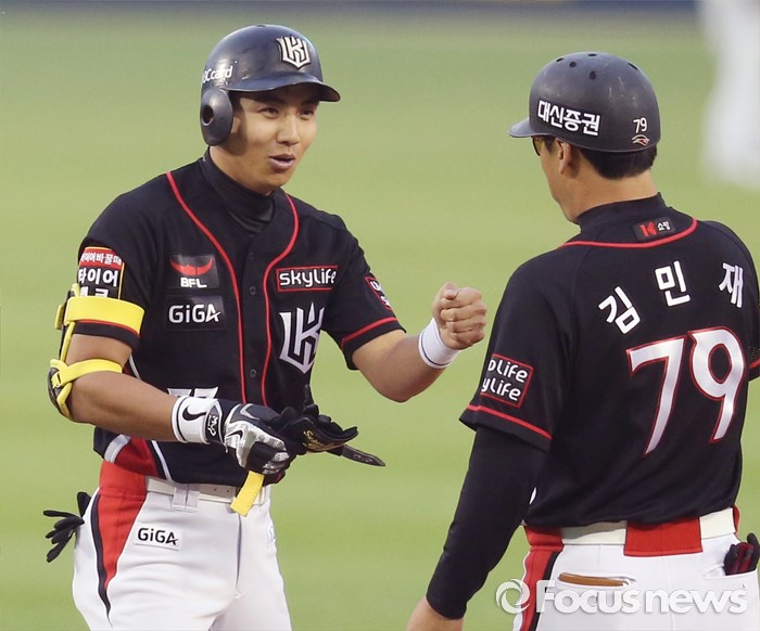 (서울=포커스뉴스) 25일 서울 잠실구장에서 열린 2016프로야구 kt-두산 경기 1회초 kt 선두타자 이대형이 두산 선발투수 장원준의 초구를 공략해 좌익선상으로 빠지는 2루타를 치고 김민재 코치와 주먹을 마주치고 있다.