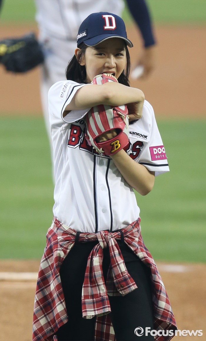 (서울=포커스뉴스) 25일 서울 잠실구장에서 열린 2016 프로야구 kt-두산 경기에 앞서 배우 신혜선이 시구 후 볼이 엉뚱한 곳으로 가자 쑥스러워하며 글러브를 깨물고 있다.있다.