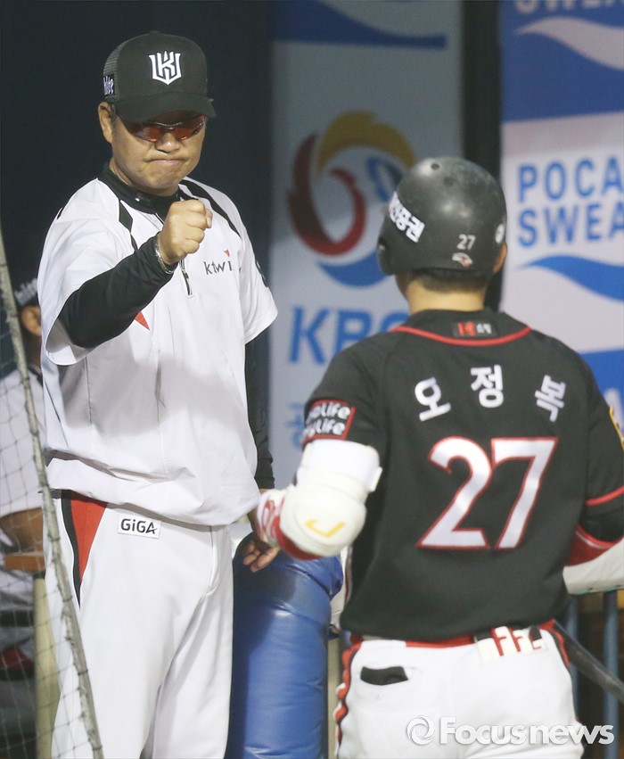 | △ 오정복을 맞이하는 kt 황병일 코치 |