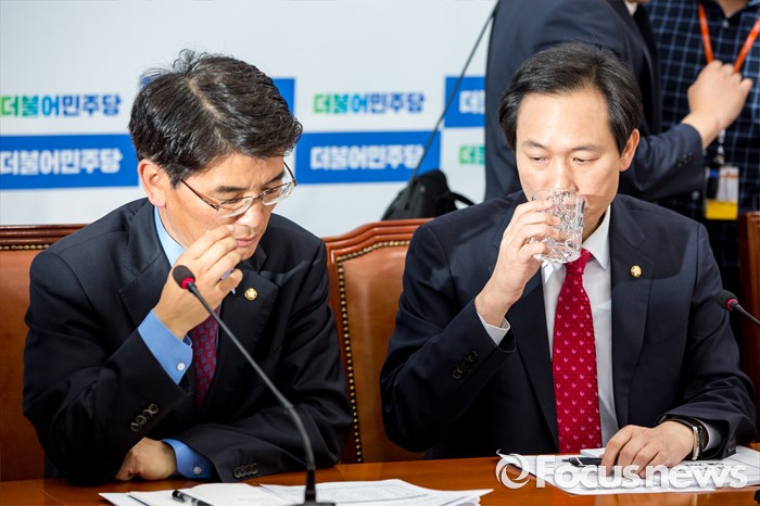 (서울=포커스뉴스) 우상호(오른쪽) 더불어민주당 원내대표와 박완주 원내수석부대표가 26일 오전 서울 여의도 국회에서 열린 정책조정회의에 참석해 대화를 나누고 있다.