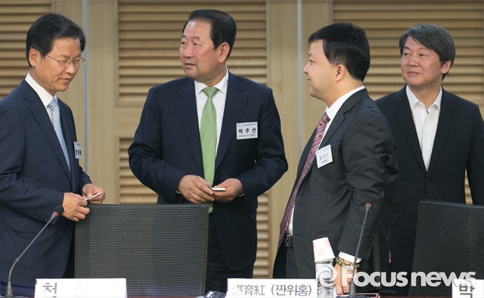 (서울=포커스뉴스) 26일 오전 서울 여의도 국회 의원회관에서 광주 지역경제 활성화와 중국 관광객 유치 방안 포럼에 앞서 참석자들이 대화하고 있다. 오른쪽부터 안철수 국민의당 상임공동대표, 짠위홍 상하이화이연합그룹 회장, 박주선 최고위원, 천정배 공동대표.