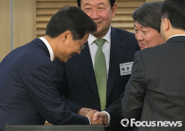(서울=포커스뉴스) 26일 오전 서울 여의도 국회 의원회관에서 열린 광주 지역경제 활성화와 중국 관광객 유치 방안 포럼에 참석한 안철수(오른쪽) 국민의당 상임공동대표와 천정배 공동대표가 인사하고 있다.
