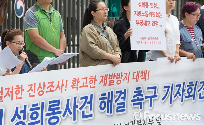 (세종=포커스뉴스) 26일 오전 세종시 정부세종청사 보건복지부 앞에서 당진수화통역센터 성희롱 사건 해결을 위한 충남지역 대책위원회 구성원들이 성희롱 사건 해결을 촉구하는 기자회견을 하고 있다.