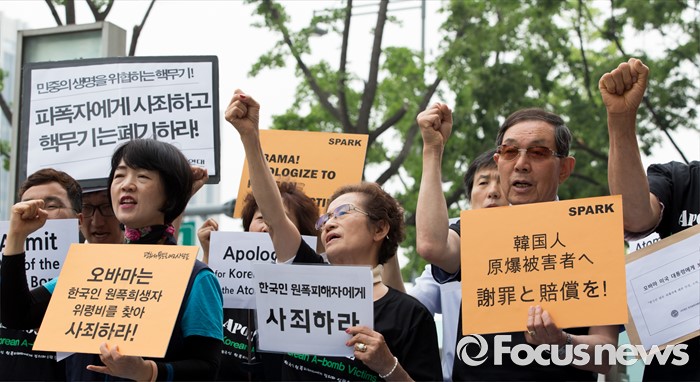 (서울=포커스뉴스) 26일 오전 서울 종로구 광화문 KT 앞에서 한국 원폭피해자와 시민사회단체가 오바마 미국 대통령의 한국 원폭 피해자들에 대한 공식 인정과 조사 및 사죄 촉구 기자회견을 하고 있다.