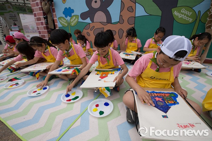 (서울=포커스뉴스) 26일 오전 서울 광진구 어린이대공원에서 열린 굿네이버스 '아프리카 희망학교 체험전'에서 초등학교 학생들이 아프리카에 보낼 가방에 그림을 그리고 있다.