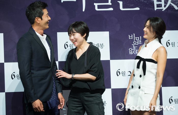 (서울=포커스뉴스) 26일 오전 서울 강남구 압구정 CGV에서 열린 영화 '비밀은 없다' 제작보고회에 참석한 배우 김주혁(왼쪽부터), 이경미 감독, 손예진이 포토타임을 갖던 중 미소를 짓고 있다.