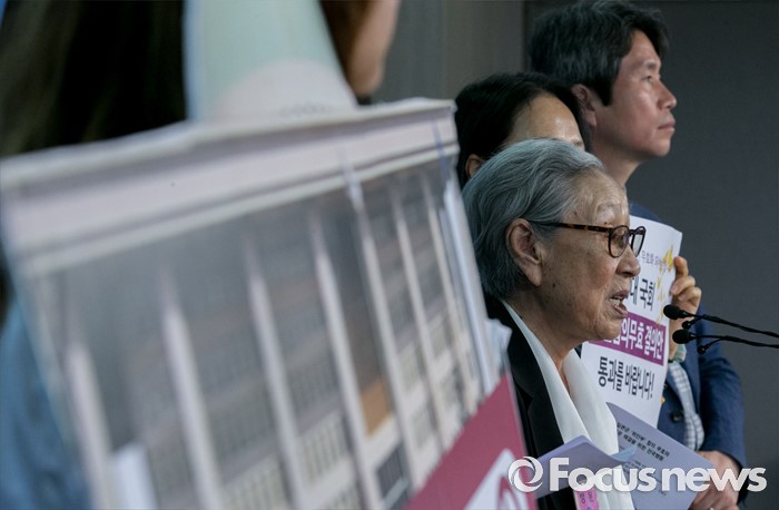 (서울=포커스뉴스) 26일 오전 서울 여의도 국회 정론관에서 홍익표, 이인영 더불어민주당 의원과 윤미향 한국정신대문제대책협의회 상임대표, 위안부 피해자 김복동 할머니 등이 한일 일본군 '위안부' 합의 무효 및 재협상을 위한 20대 국회의 역할 촉구 기자회견을 하고 있다.