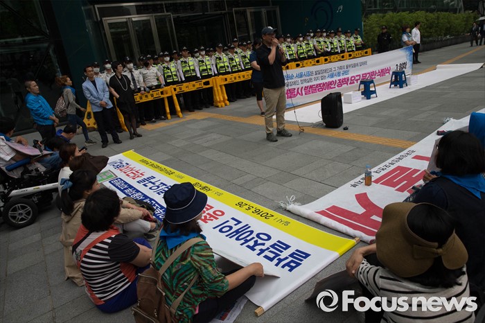 (서울=포커스뉴스) 26일 오전 서울시청 정문앞에서 전국장애인 부모연대와 서울특수학교학부모협의회원들이 발달장애인 정책 수립을 촉구하며 기자회견을 하고 있다.