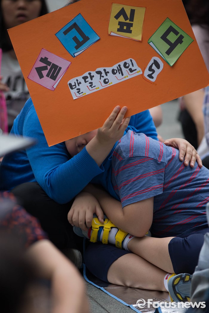 (서울=포커스뉴스) 26일 오전 서울시청 정문앞에서 전국장애인 부모연대와 서울특수학교학부모협의회원들이 발달장애인 정책 수립을 촉구하며 기자회견을 하고 있다.