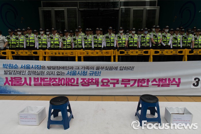 (서울=포커스뉴스) 26일 오전 서울시청 정문앞에서 전국장애인 부모연대와 서울특수학교학부모협의회원들이 발달장애인 정책 수립을 촉구하며 기자회견을 하고 있다.