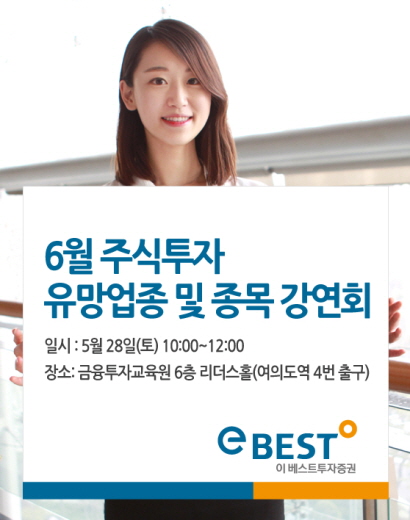 (서울=포커스뉴스) 이베스트투자증권은 오는 28일 금융투자교육원 리더스홀에서 ‘6월 주식투자 유망업종 및 종목 강연회’를 개최한다고 26일 밝혔다.