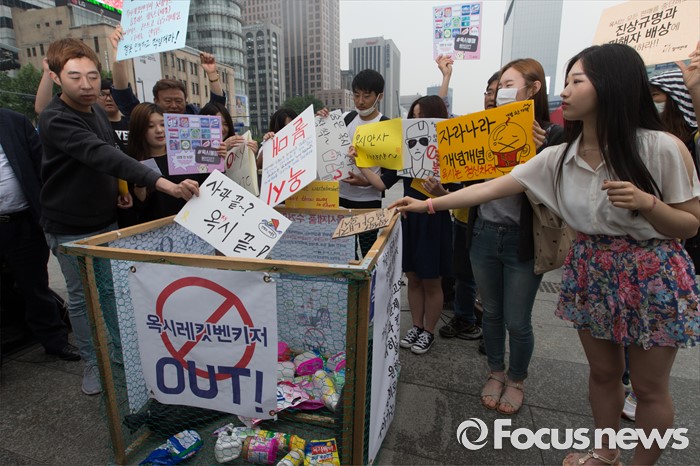 (서울=포커스뉴스) 26일 오후 서울 광화문광장에서 성공회대 학생모임과 청년참여연대 관계자들이 옥시 제품 불매 동참 선언 퍼포먼스를 펼치고 있다.